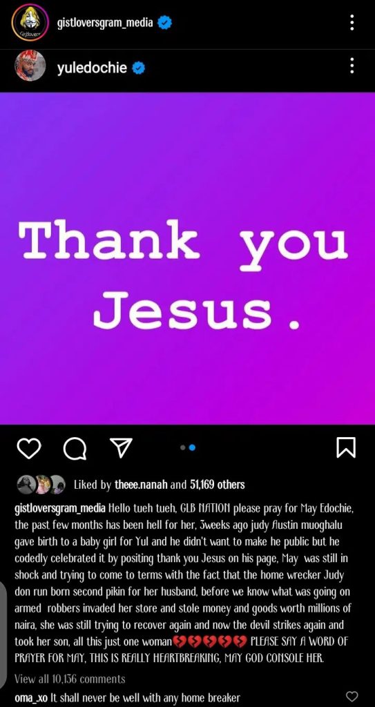 “Hello tueh tueh, GLB NATION please pray for May Edochie, the past few months has been hell for her, weeks ago Judy Austin muoghalu gave birth to a baby girl for Yul and he didn’t want to make he public but he codedly celebrated it by positing thank you Jesus on his page.