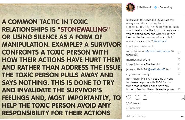 Probably angered by Iceberg Slim’s revelation, Juliet Ibrahim fired back by stating that he is a narcissist who is actually the toxic or crazy one.