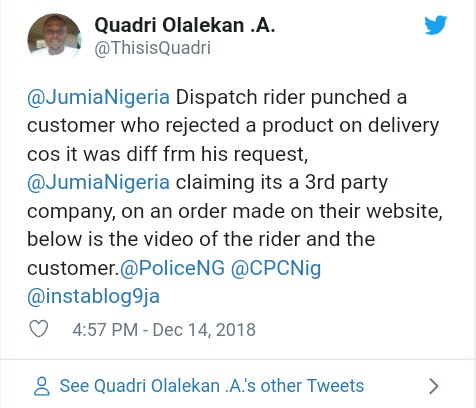 @JumiaNigeria Dispatch rider punched a customer who rejected a product on delivery cos it was diff frm his request, @JumiaNigeria claiming its a 3rd party company, on an order made on their website, below is the video of the rider and the customer
