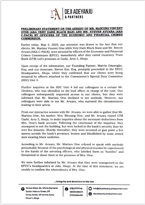 According to the statement titled “Preliminary Statement on the Arrest of Mr. Martins Vincent Otse (aka Very Dark Black Man) and Mr. Steven Avuara (aka C-Pack) by Officers of the Economic and Financial Crimes Commission“, the incident occurred on May 2, 2025, shortly after Mr. Otse, his mother Mrs. Blessing Otse, and Mr. Avuara visited Guaranty Trust Bank (GTBank), Garki, Area 3, Abuja, to inquire about “the incessant deductions from Mrs. Otse’s bank account.”