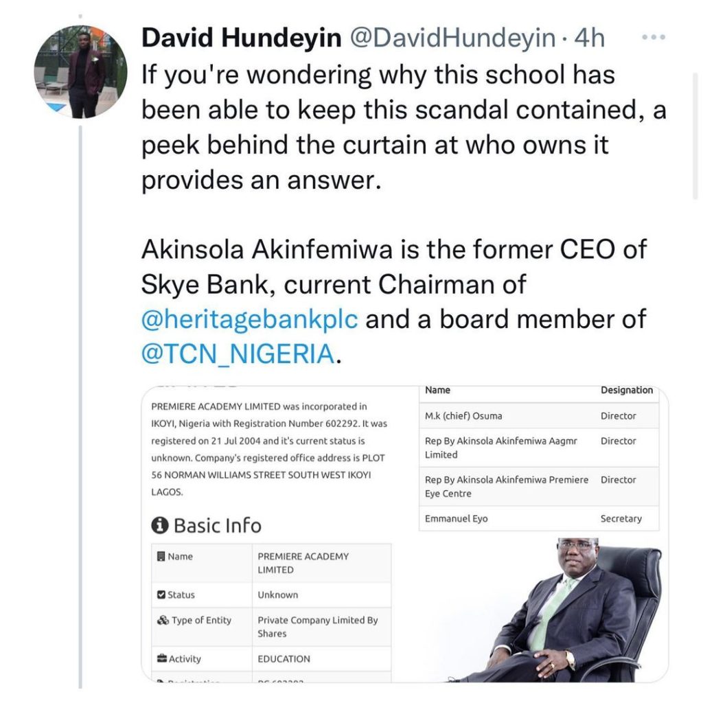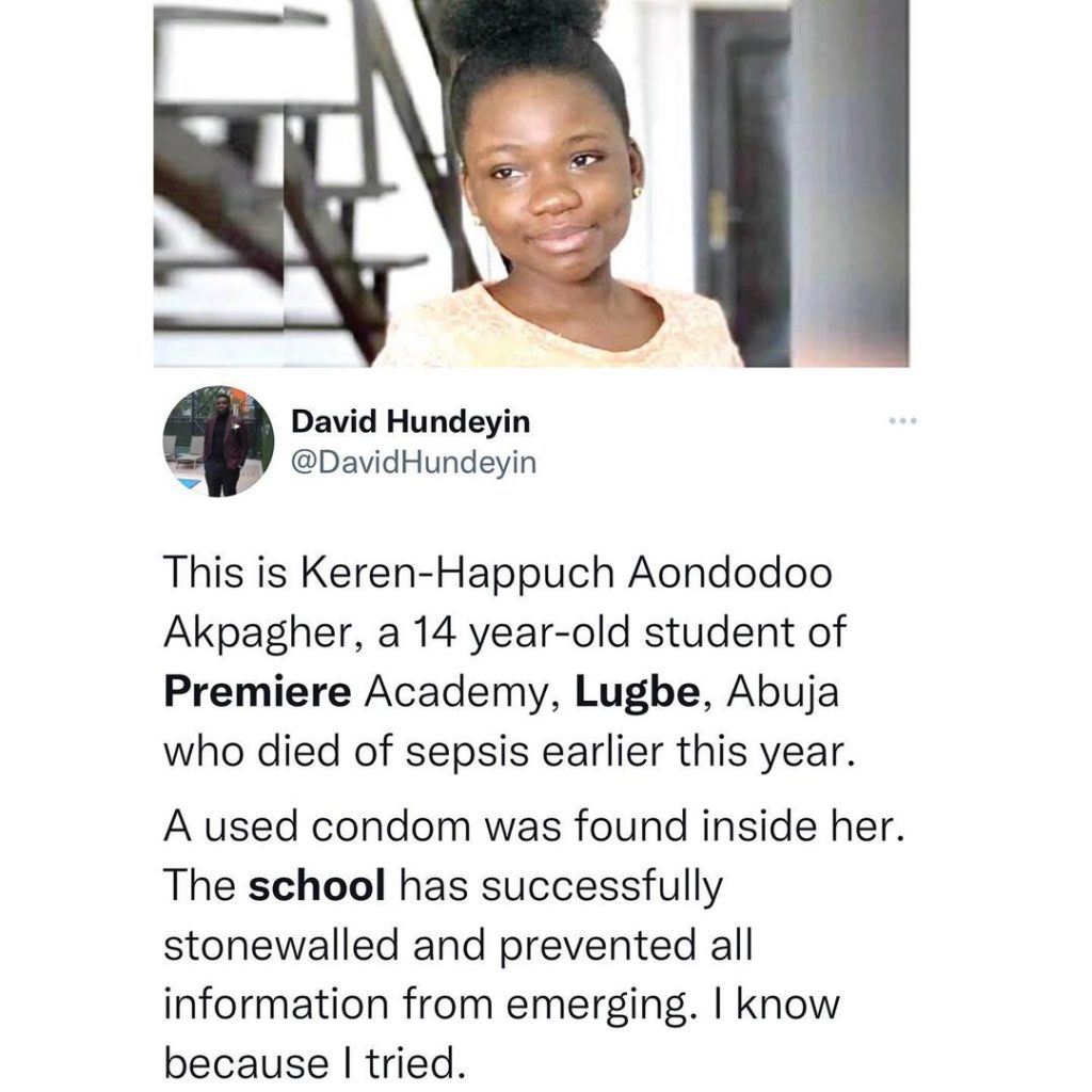 Nigerian Journalist, David Hundeyin has revealed that a 14-year-old female boarding student in Premier College, Lugbe, Abuja, Miss Karen-Happuch Aondodoo Akpagher was raped inside school premises, leading to her excruciatingly painful death by sepsis earlier this year, IgbereTV reports.
