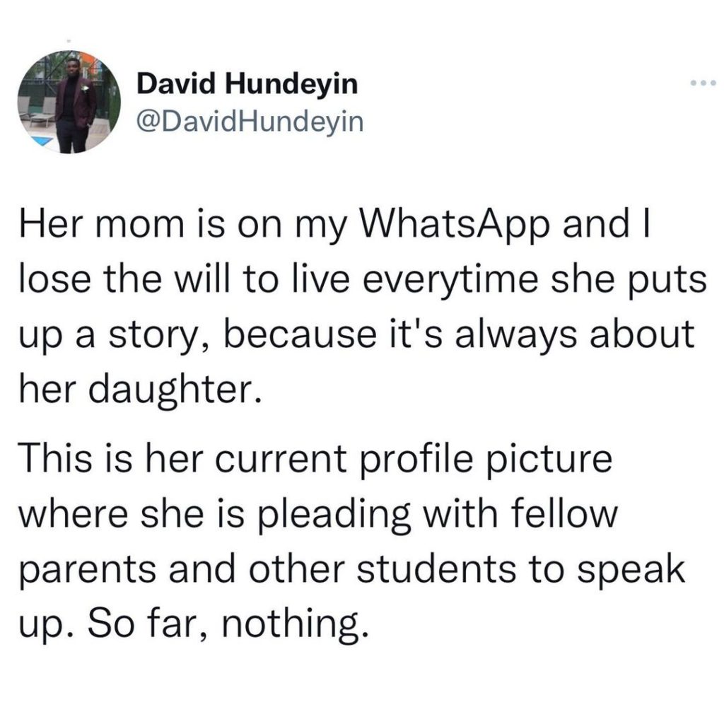 Her mom is on my WhatsApp and I lose the will to live everytime she puts up a story, because it’s always about her daughter. This is her current profile picture where she is pleading with fellow parents and other students to speak up. So far, nothing.