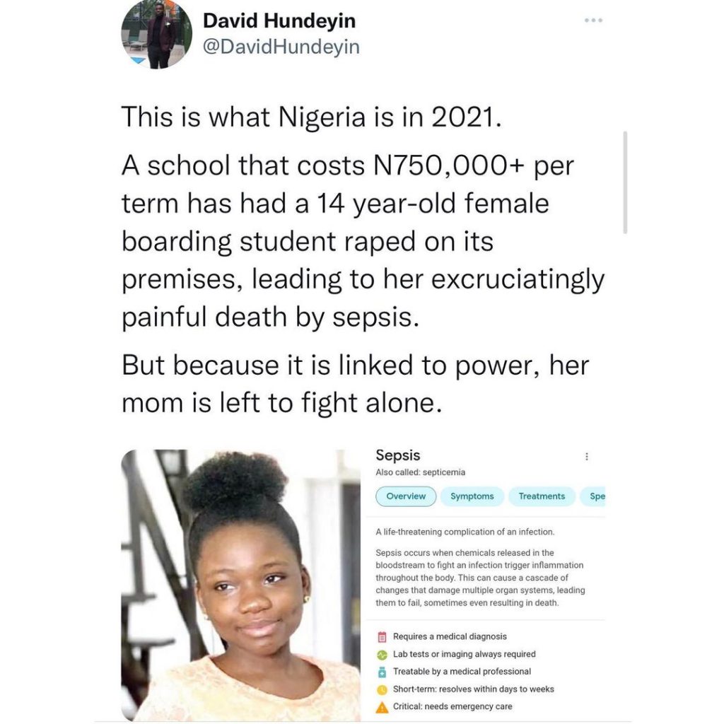 This is what Nigeria is in 2021. A school that costs N750,000+ per term has had a 14 year-old female boarding student raped on its premises, leading to her excruciatingly painful death by sepsis. But because it is linked to power, her mom is left to fight alone.