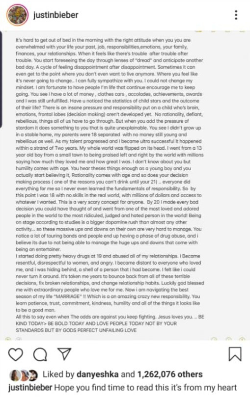 Justin Bieber shared a lengthy post where he opened up about his struggles with stardom, how being a child star affected him and led him to doing drugs, disrespecting women, and almost destroyed his life by getting him to the point where he didn’t want to “live anymore”.