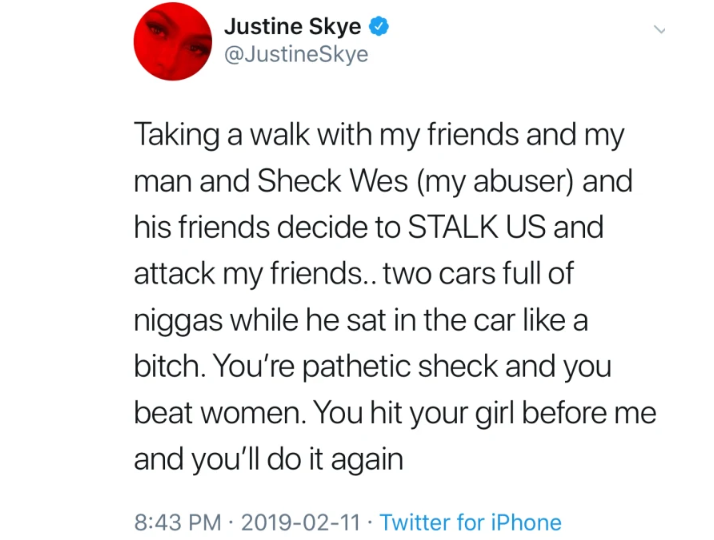 In a pair of tweets posted last night, Justine referred to Sheck Wes as her “abuser.” She also claimed that Sheck Wes and a group of men stalked her and her friends and then attacked them. “You’re pathetic Sheck and you beat women,” she wrote. “You hit your girl before me and you’ll do it again.”