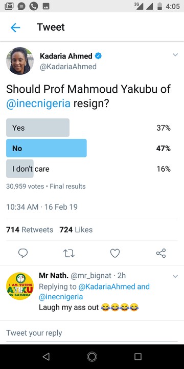She conducted a quick poll but unfortunately lost as Nigerians voted by a margin of 10% voted against resignation of the INEC boss. Obeservers believe had Nigerians been given more time to vote in her poll the margin would have been wider perhaps more than the humiliation of MC Oluomo.