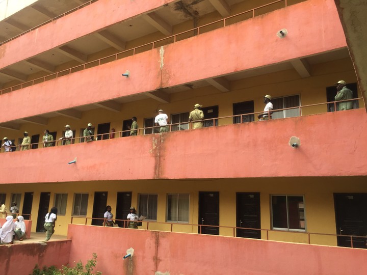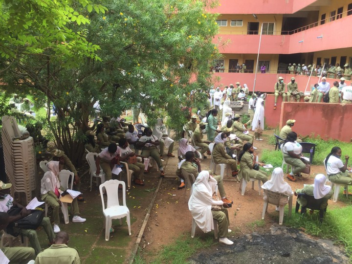 This is the 2019 Batch B stream 1 corper’s Observing social distancing while waiting to collect their NYSC discharge certificate.. Corper Wee.