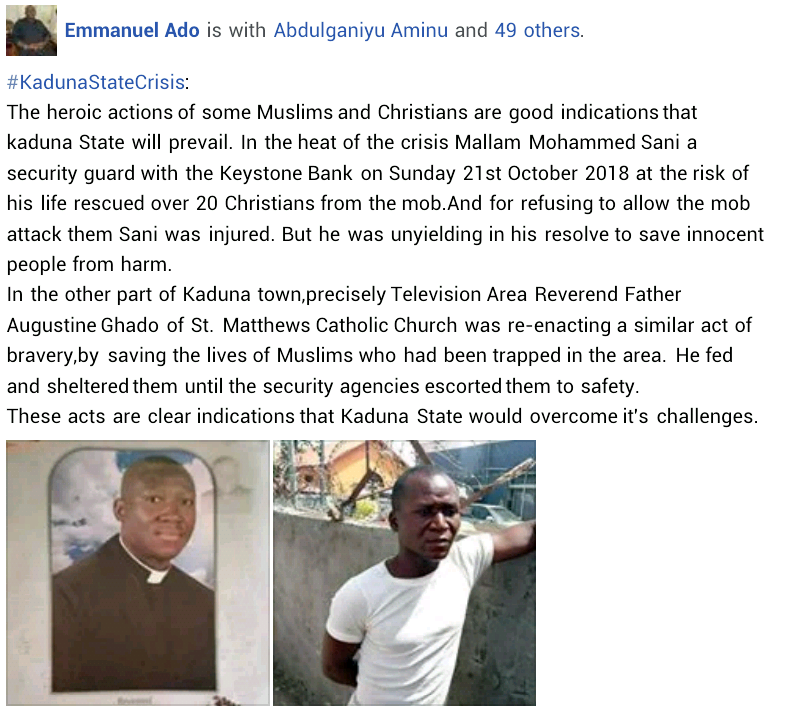 The heroic actions of some Muslims and Christians are good indications that kaduna State will prevail. In the heat of the crisis Mallam Mohammed Sani a security guard with the Keystone Bank on Sunday 21st October 2018 at the risk of his life rescued over 20 Christians from the mob.And for refusing to allow the mob attack them Sani was injured. But he was unyielding in his resolve to save innocent people from harm.