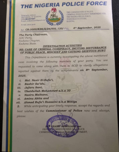 The Kaduna state police command has summoned the immediate past governor of Kaduna State, Nasir El-Rufai, alongside key members of the African Democratic Congress (ADC) in Kaduna.