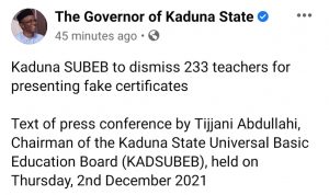6. As part of our duty of transparency, the names of the 233 teachers found to have presented fake certificates will be uploaded on the website of the Kaduna State Government today.