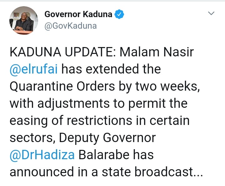 Malam Nasir @elrufai has extended the Quarantine Orders by two weeks, with adjustments to permit the easing of restrictions in certain sectors, Deputy Governor @DrHadiza Balarabe has announced in a state broadcast…