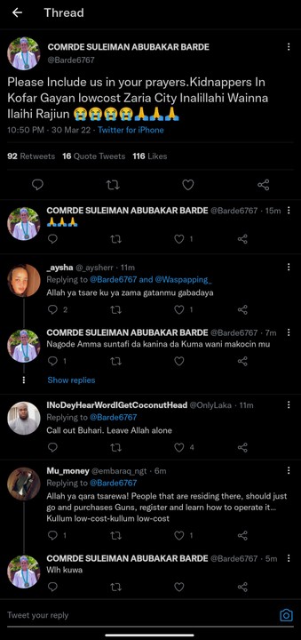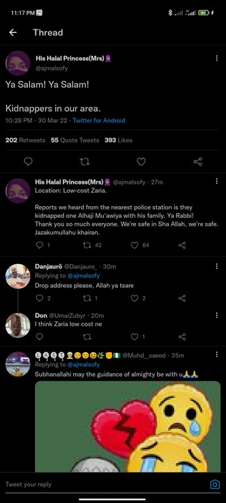 A female Twitter user claimed a Mallam and his family were kidnapped. The attacked seemed to have began by 10:20 pm on Wednesday.