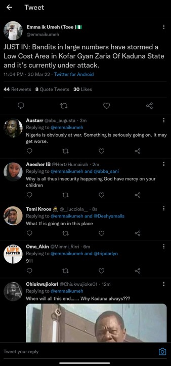 Reports from multiple Twitter users claim that Bandits a.k.a Terrorists have stormed a low cost area in Zaria, Kaduna State and are shooting sporadically.