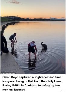 David Boyd shared the rescue footage to Facebook after he had seen the kangaroo stuck in the freezing waters of Lake Burley Griffin in Canberra on Tuesday morning.