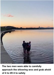 A frightened and exhausted kangaroo has been pulled to safety by two men willing to wade into chilly waters in a heartwarming rescue.