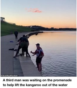Luckily, the two men were able to grab a hold of the worried roo and lift it to safety onto the promenade, where a third man was waiting to assist.