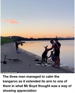 The three men managed to calm the kangaroo as it extended its arm to one of them in what Mr Boyd thought was a way of showing appreciation.