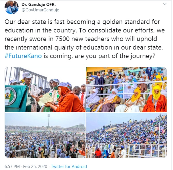 He made this known during the launching of Basic Education Service Delivery for All (BESDA) and Distribution of Offer of Appointment to 7,500 volunteer teachers, held at Sani Abacha Stadium, Kofar Mata, Tuesday.