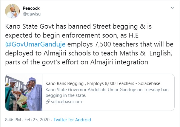 Kano State Governor Abdullahi Umar Ganduje on Tuesday ban begging in the state.