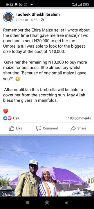 Taofeek went ahead and bought the woman an umbrella to help her through the small business, against sun and rain.