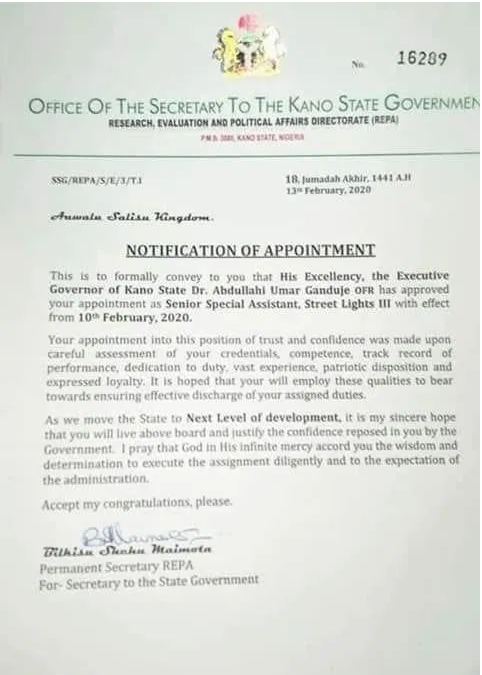 “This is to formally convey to you that His Excellency, the Executive Governor of Kano State Dr. Abdullahi Umar Ganduje OFR has approved your appointment as Senior Special Assistant, Street Lights III with effect from 10th February 2020.
