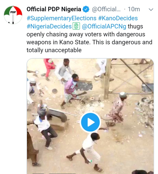 “Official APC Nigeria thugs openly chasing away voters with dangerous weapons in Kano State. This is dangerous and totally unacceptable”.
