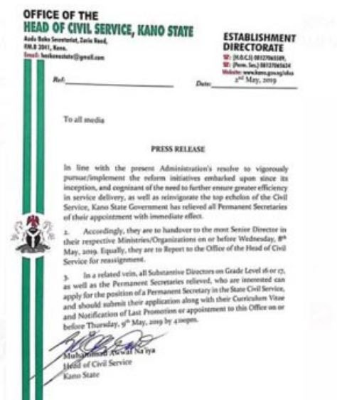 The Kano Government has sacked all Permanent Secretaries in the state, in line with the present government’s reformation resolve.