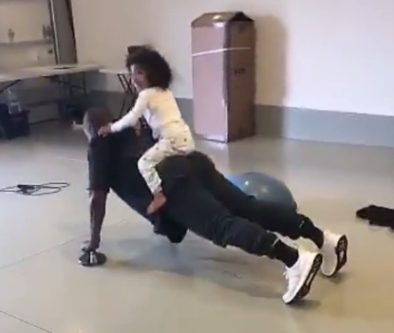 Kanye West does push-ups with his daughter North on his back!