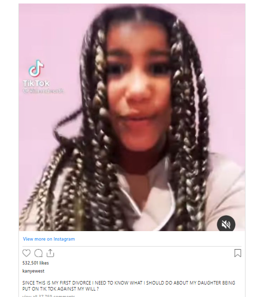 “Since this is my first divorce I need to know what I should do about my daughter being put on [TikTok] against my will?” the Donda 2 artist said in the post, notably tagging Kim Kardashian.