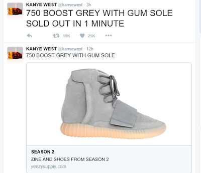 Kanye West who announced the sale of the Adidas Yeezy Boost 750 Grey Gum last week launched its sale online yesterday and it sold out. The Yeezys which were made in collabo with Adidas only had 9,000 pairs and were sold at $350 each and every pair was gone within 1 minute.
