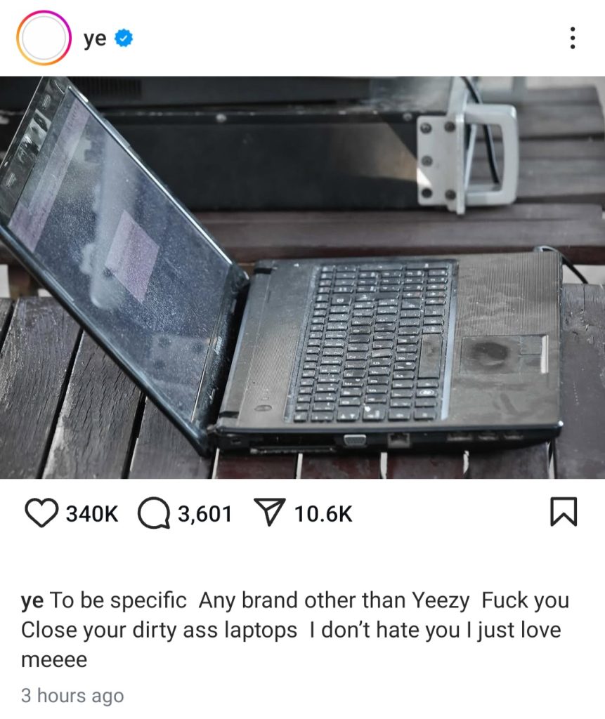 He shared a photo of a dusty old laptop and wrote: “To be specific Any brand other than Yeezy Fu** you Close your dirty ass laptops I don’t hate you I just love melee.”