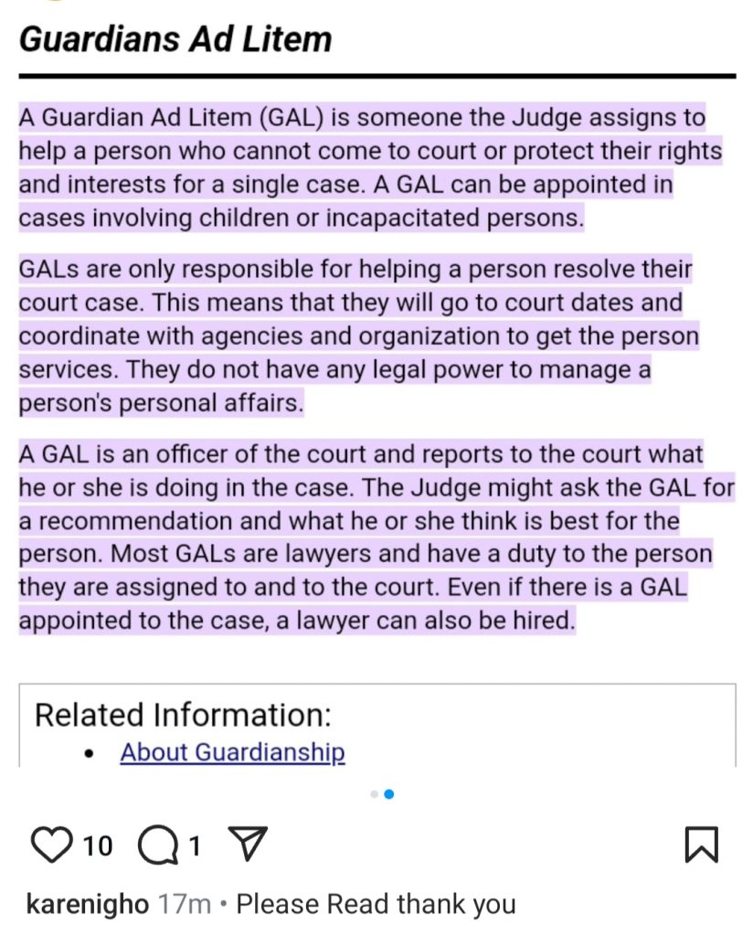 According to a document she shared, a GAL is assigned to children or those who are incapacitated and she said she is neither.