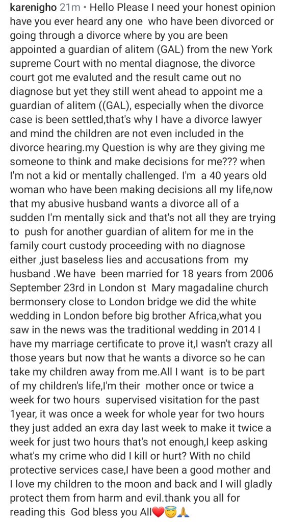 The Nigerian actress said she has been assigned a Guardian Ad Litem (GAL) by the New York Supreme Court, despite the fact that she has not been diagnosed to be mentally unfit.
