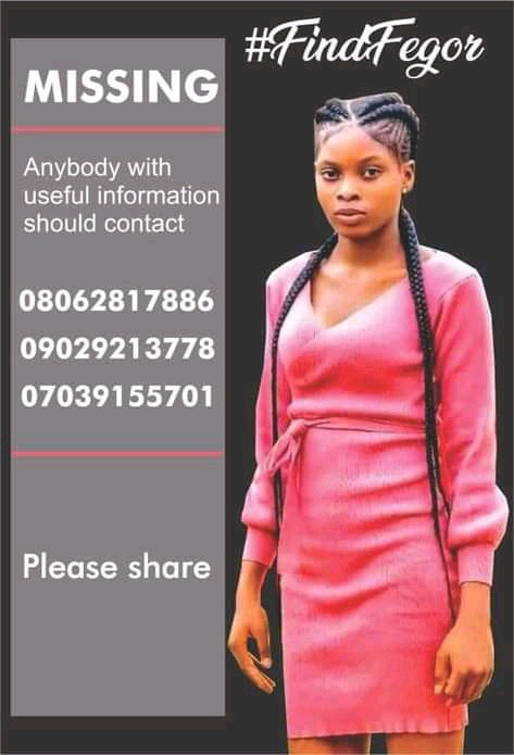 A 22-year-old woman identified as Katherine Isaiah also known as Fegor has gone missing since she travelled to Warri, Delta State, IgbereTV reports.