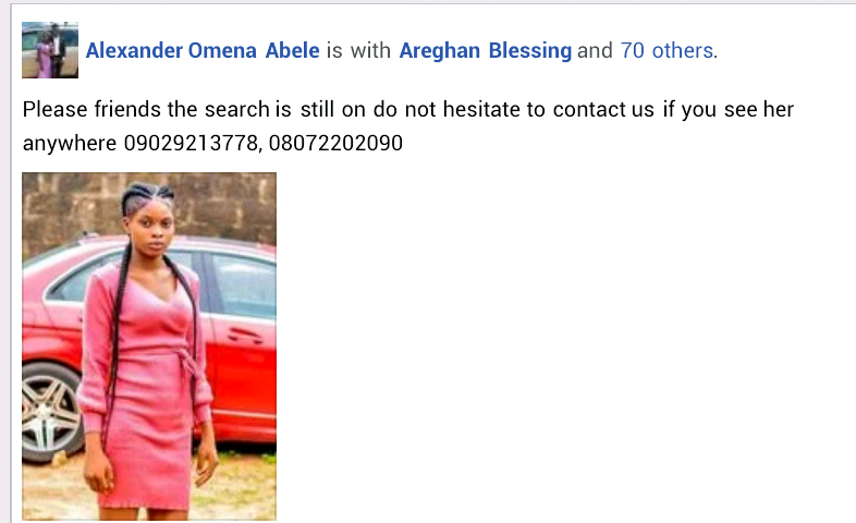 “Please friends the search is still on do not hesitate to contact us if you see her anywhere 09029213778, 08072202090”