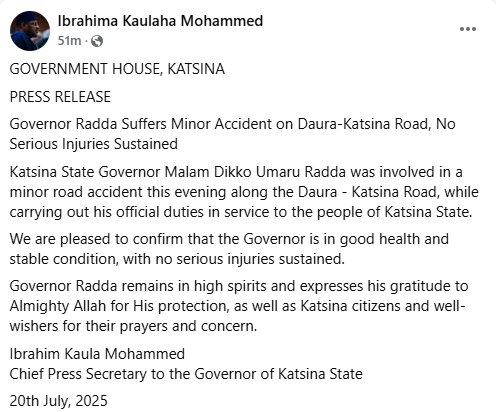 “Katsina State Governor Malam Dikko Umaru Radda was involved in a minor road accident this evening along the Daura – Katsina Road, while carrying out his official duties in service to the people of Katsina State,” the statement read.