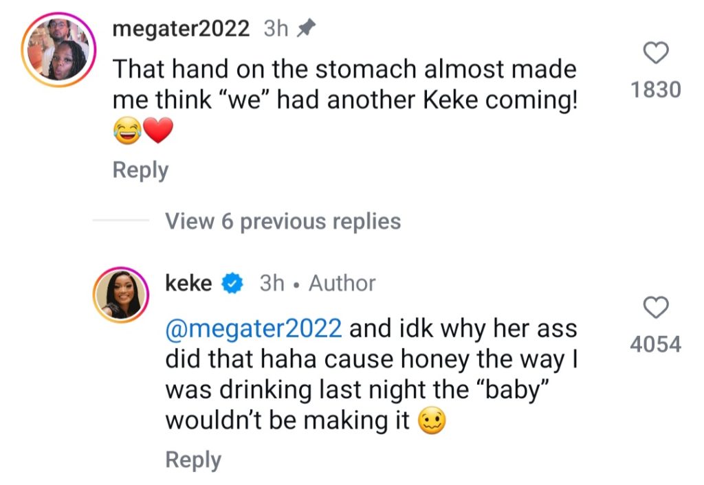 A follower reacted,  saying she almost thought Keke was pregnant again.