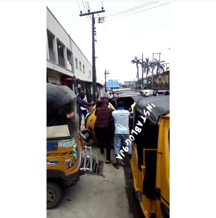 Commercial tricyclists trap a #Lastma official who seized their colleague’s tricycle, today, in #Ikeja, #LagosState.