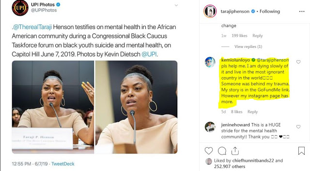 Controversial Journalist, Kemi Olunloyo has taken her plea for financial and mental assistance international as photos of her begging Taraji P. Henson for support surfaced online today.