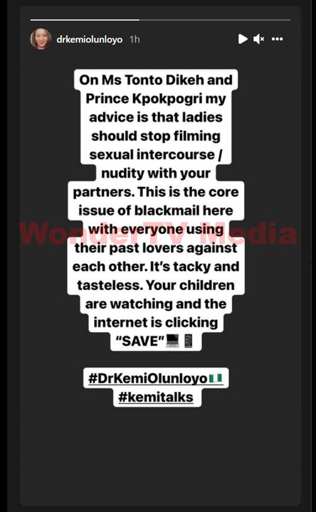 “On Ms Tonto Dikeh and Prince Kpokpogri my advice is that ladies should stop filming sexual intercourse/nudity with your partners. This is the core issue of blackmail here with everyone using their past lovers against each other. It’s tacky and tasteless. Your children are watching and the internet is clicking