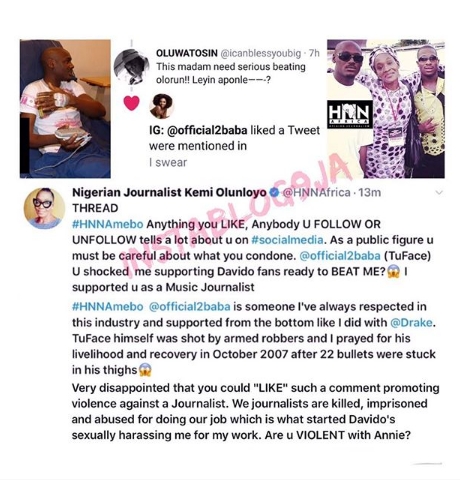 Popular Blogger Kemi Olunloyo expresses shock as 2face likes a comment calling for violence against her.