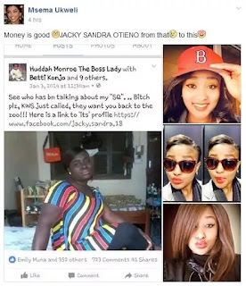 Interestingly, Huddah Monroe, the runs girl who made people call Sarah Otieno ugly, herself was a product of bleaching and plastic surgery.