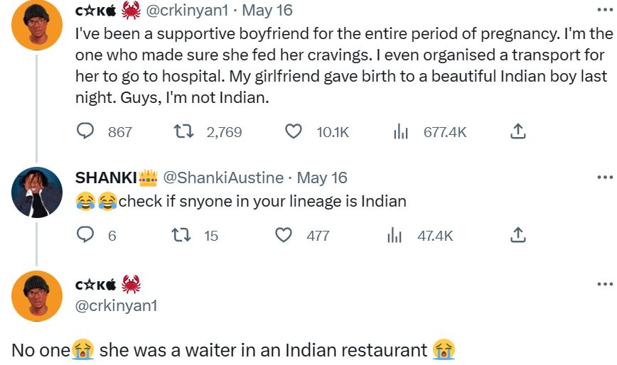 @Crkinyan1 who described himself as a “supportive boyfriend”, recalled how he supported his girlfriend through her pregnancy journey only for her to give birth to a biracial baby.