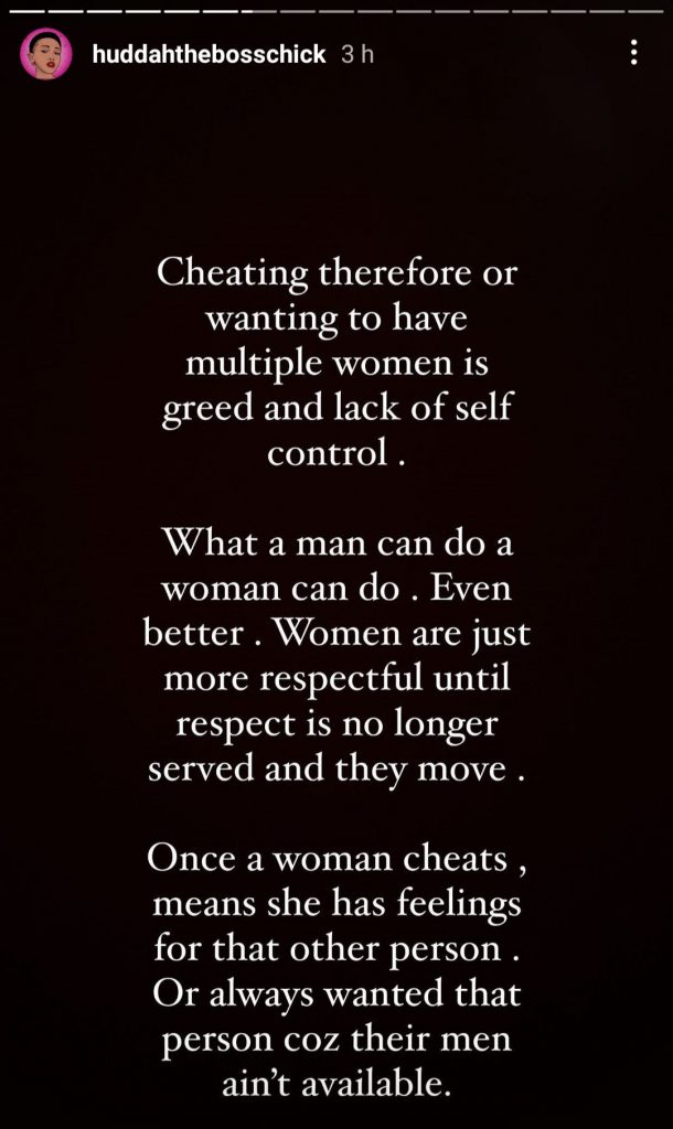 Popular Kenyan Socialite, Huddah Monroe took to Instagram to reveal that men can’t be the only ones unfaithful in relationships, women too can be.