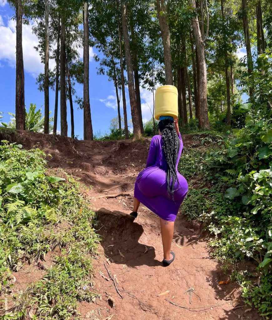 Vera Sidika has shared new photos of herself in the village. The Kenyan socialite said she visited her 97-year-old grandma. She proceeded to show herself cooking and going to fetch water with a keg on her head. See photos below.