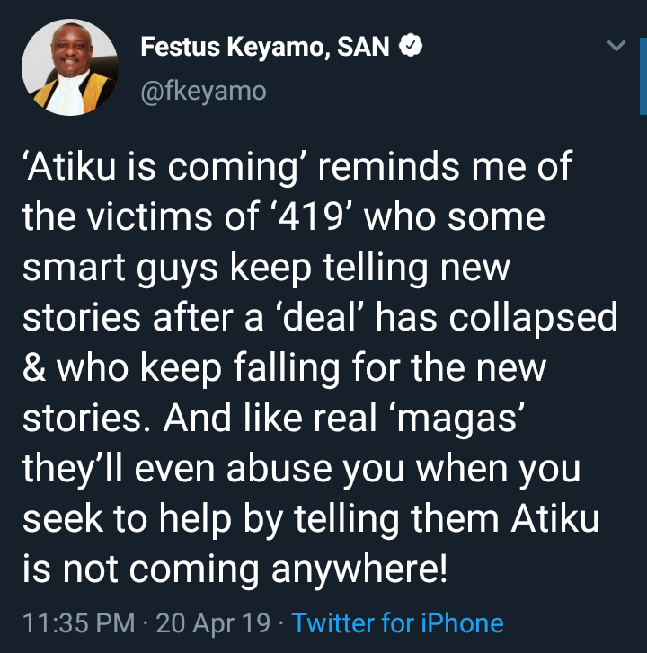 ‘Atiku is coming’ reminds me of the victims of ‘419’ who some smart guys keep telling new stories after a ‘deal’ has collapsed & who keep falling for the new stories. And like real ‘magas’ they’ll even abuse you when you seek to help by telling them Atiku is not coming anywhere!
