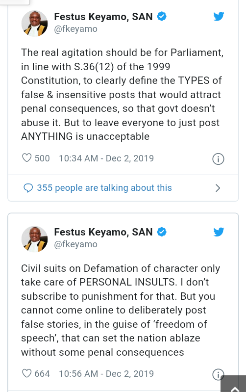 “The real agitation should be for Parliament, in line with S.36(12) of the 1999 Constitution, to clearly define the TYPES of false & insensitive posts that would attract penal consequences, so that govt doesn’t abuse it. But to leave everyone to just post ANYTHING is unacceptable.”
