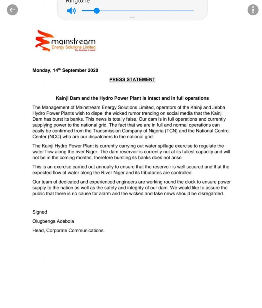 Press Statement from Mainstream Energy Solutions Ltd, operators of the Kainji and Jebba Hydropower Plants. @ARISEtv @daily_trust @THISDAYLIVE @MobilePunch @TCN_NIGERIA