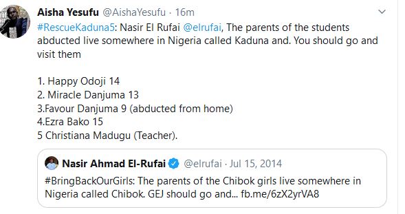 Aisha Yesuf has taken to twitter to remind El-Rufai of the need to visit parents of the Kaduna Students who were kidnapped just like he asked GEJ to do the same when Chibok girls were Kidnapped.