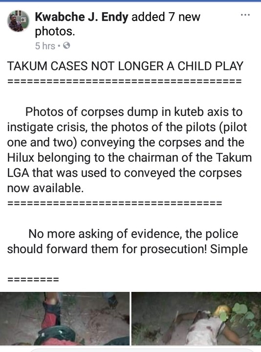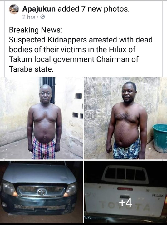 Suspected kidnappers were arrested with dead bodies of their victims in a Hilux alleged to be own by Takum Local Government Chairman of Taraba state.According to report,they dumped the corpses to instigate crisis.